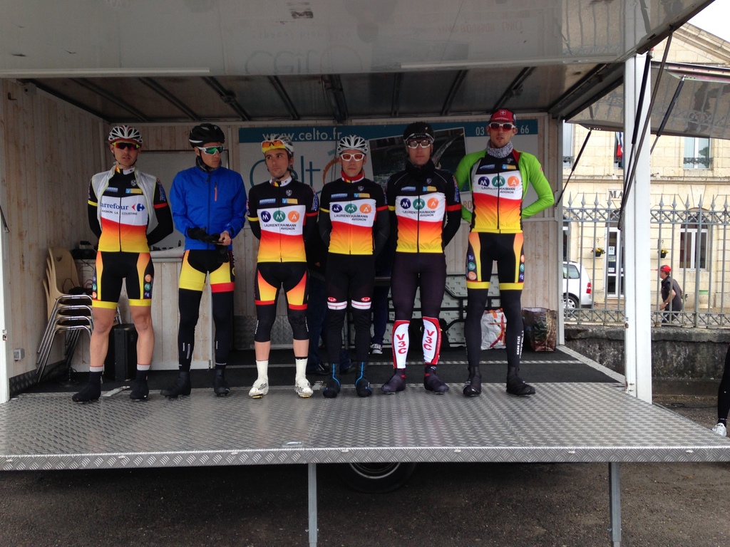 Dimanche, il nous a poussé des ailes pour le chrono matinal. Malheureusement, nous n’étions pas les seuls concernés. Un fort vent favorable nous a accompagné tout au long des 13,7 km d’un tracé pour purs spécialistes (longues lignes droites légèrement vallonnées et petit talus final). Sans surprise, le dernier champion de France Juniors de la discipline, Louis Louvet (SCO Dijon), s’est imposé. Et avec une jolie moyenne (52,52 km/h !). Loick n’a concédé que 30 secondes pour finir 12e. A plus de 50 km/h de moyenne également. Ce qui est joli. Seb, Julien P. et moi ont fini dans le ventre mou du classement. Et Loic, encore malchanceux, n’a pu défendre ses chances équitablement. Le commissaire lui a interdit, à tort, l’utilisation de son vélo de chrono.