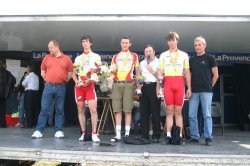 Photo : Le podium juniors (De gauche à droite : Mr Leleu Maire-adjoint de Montfavet, Alexandre Jouve, Paul Rostollan, André le speaker, Damien Chaillan et Jacques Constensou le président du CVC)