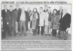 Cela s'est passé vendredi soir, au Parc des Sports d'Avignon, à l'occasion du match de ligue 2 : AC Arles-Avignon - FC Tours... Mr Joubert Bompard, adjoint délégué aux Sports, accompagné de Mr Bodren (Directeur des Sports), a présenté aux Présidents de clubs réunis les mécènes du Club des Partenaires créé en 2009. L'objectif de ce Club est de soutenir les clubs sportifs avignonnais évoluant au plus haut niveau en leur apportant des moyens financiers supplémentaires.