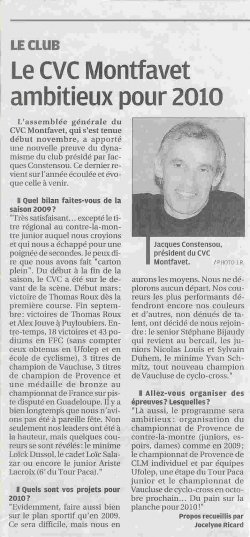Le Président interviewé dans la Provence du 26/11/09... à défaut de "Vélo Magazine"... L'occasion de faire le point sur le bilan exceptionnel de la saison 2009 et sur les projets 2010. Merci donc à Jocelyne Ricard pour son article "3 questions à..." paru dans la page des Sports de jeudi 26 novembre.