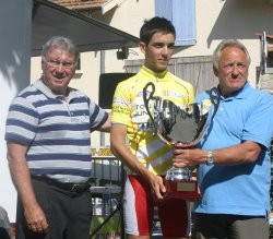 Photo : Le trophée "Raoul Rémy" , récompensant le vainqueur final du Tour PACA, dans les mains de Thomas (à gauche Michel Bergeat, à droite l'ancien pro Gilbert Bellone).