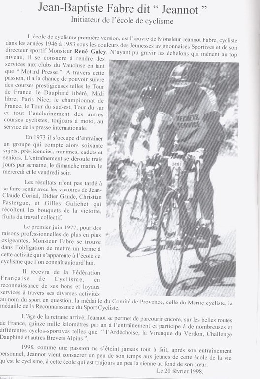 C'est avec tristesse que nous venons d'apprendre le décès de Jean Baptiste Fabre dit Jeannot, initiateur de notre école de cyclisme. Ces obséques civiles auront lieu le Jeudi 4 avril à 10 h, chambre funéraire au Pontet suivi de l'inhumation au cimetière St Véran à Avignon. Le CVCM présente ses sincères condoléances à sa famille.
