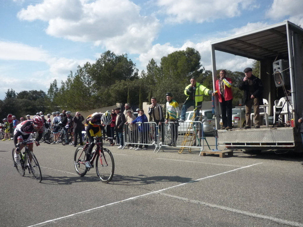 Départ au pied de la montée et déjà une chute environ quatre coureurs devant moi et il faut déjà faire l'effort pour rejoindre le paquet. Je prends mes repères durant le premier tour et dans le deuxième passage dans la montée, à un kilomètre du sommet, avec un coureur de Sainte Tulle (qui avait fini premier à Cavaillon et qui finira deuxième aujourd'hui) nous attaquons mais le peleton fait l'effort pour nous reprendre. Les tours s'enchainent, les tentatives aussi mais reprisent à chaque fois. Plusieurs fois je prends l'initiative de faire l'effort pour aller reprendre des fuyards, le peleton tardant à réagir et semblant plus préoccupé par mon collègue de Sainte Tulle et moi.