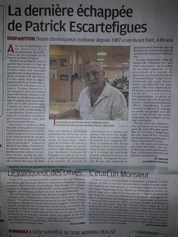 C'est avec tristesse que nous apprenons le décès de Patrick Escartefigues Journaliste de La provence. Le Christophe Vélo Club Montfavet présente ses sincères condoléances à sa famille et à ses proches